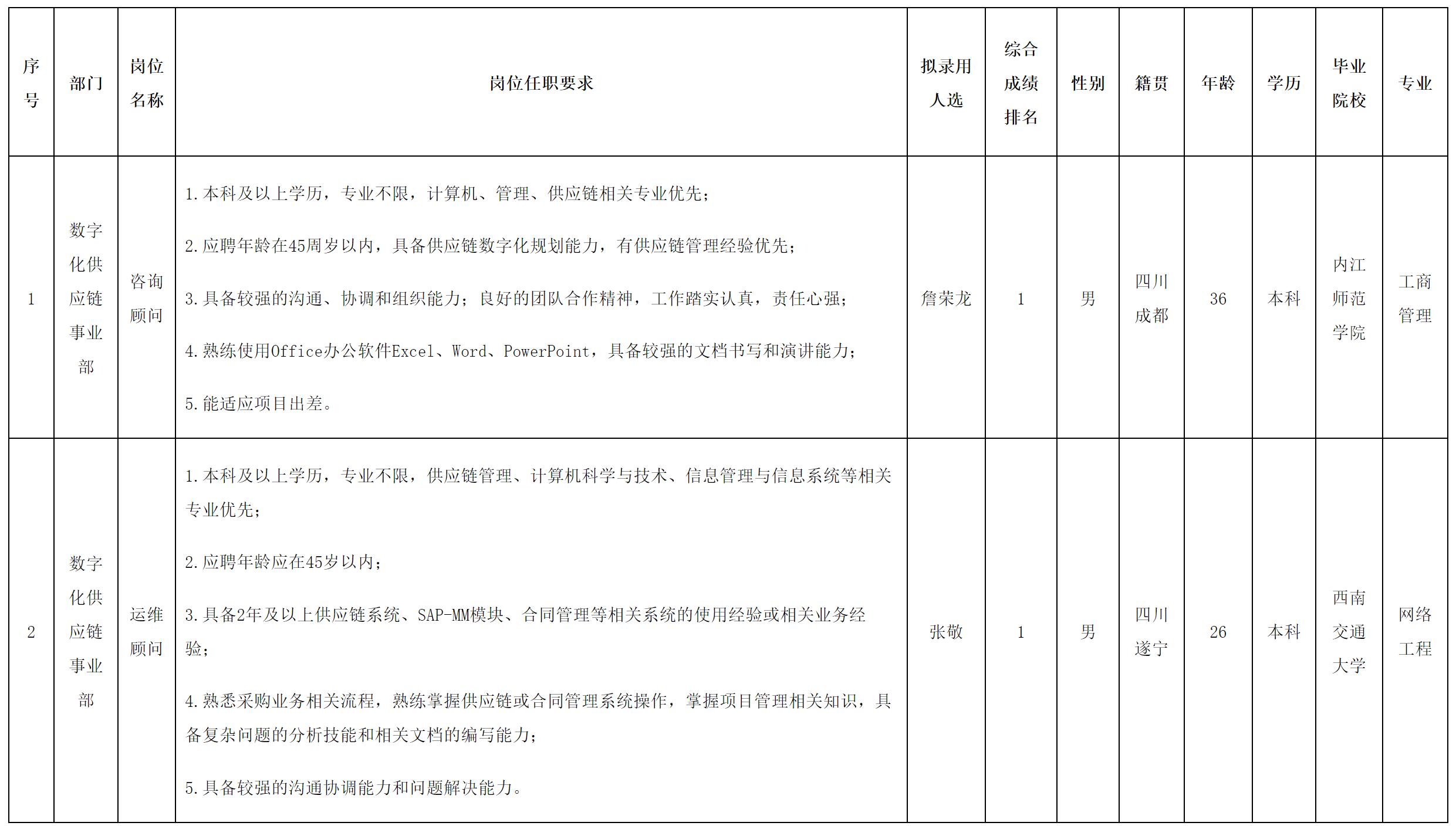 根據(jù)四川虹信軟件股份有限公司發(fā)布的招聘公告及招聘相關(guān)規(guī)定,經(jīng)測試、考察、體檢等程序,擬錄用詹榮龍、張敬同志到四川虹信軟件股份有限公司工作,現(xiàn)予以公示,具體情況如下: