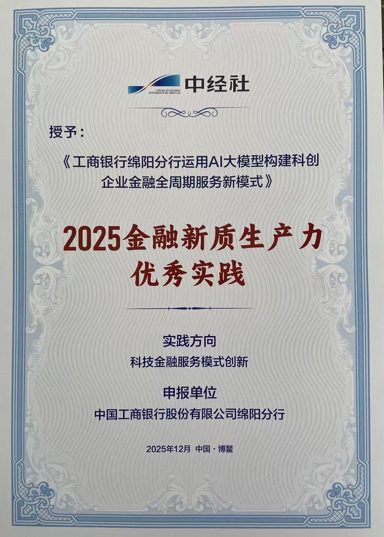 12月4日,在2025企業(yè)家博鰲論壇重要活動中,工商銀行綿陽分行《運用AI大模型構建科創(chuàng)企業(yè)金融全周期服務新模式》實踐案例,被授予“2025金融新質生產力優(yōu)秀實踐”獎項。
