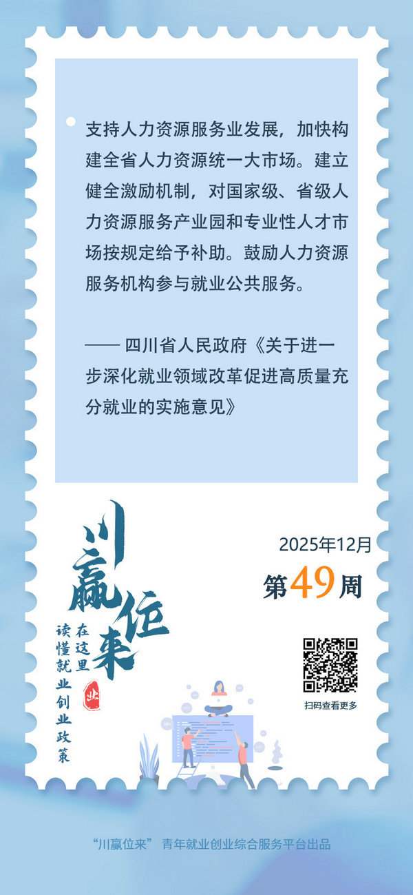 “四川將加快構(gòu)建全省人力資源統(tǒng)一大市場,鼓勵人力資源服務(wù)機構(gòu)參與就業(yè)公共服務(wù)。”四川省人民政府近日印發(fā)的《關(guān)于進一步深化就業(yè)領(lǐng)域改革促進高質(zhì)量充分就業(yè)的實施意見》明確提出,要發(fā)揮專業(yè)化人力資源服務(wù)促就業(yè)作用,建立健全激勵機制,對國家級、省級人力資源服務(wù)產(chǎn)業(yè)園和專業(yè)性人才市場按規(guī)定給予補助。