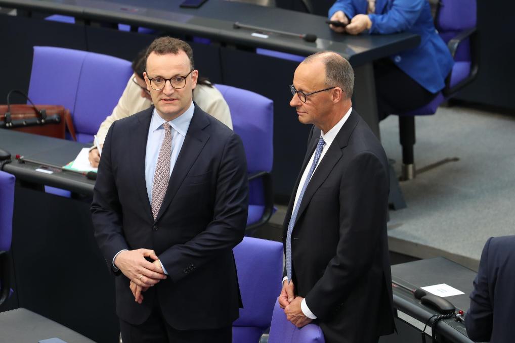 5月6日,在德國(guó)首都柏林的國(guó)會(huì)大廈,默茨(右)在第二輪投票議程中。新華社記者杜哲宇攝
