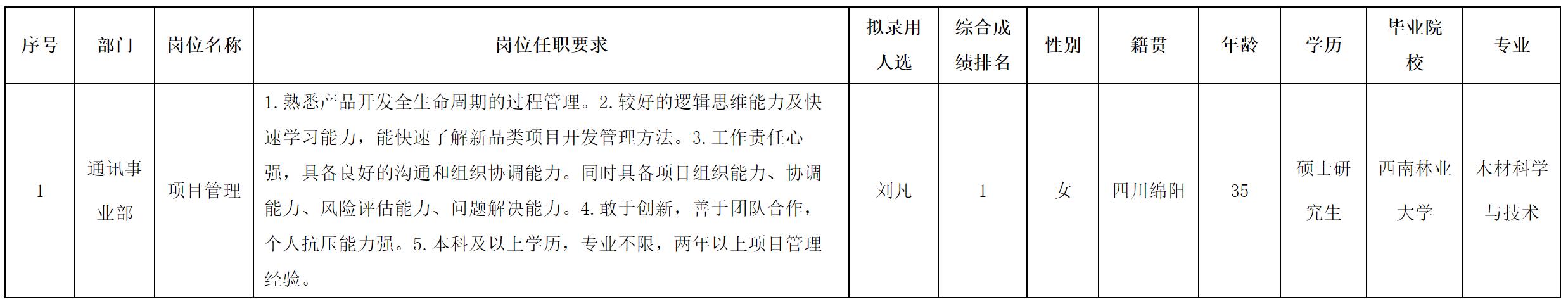 根據(jù)四川華豐科技股份有限公司發(fā)布的招聘公告及招聘相關(guān)規(guī)定,經(jīng)測(cè)試等程序,擬錄用劉凡同志到四川華豐科技股份有限公司工作,現(xiàn)予以公示,具體情況如下: