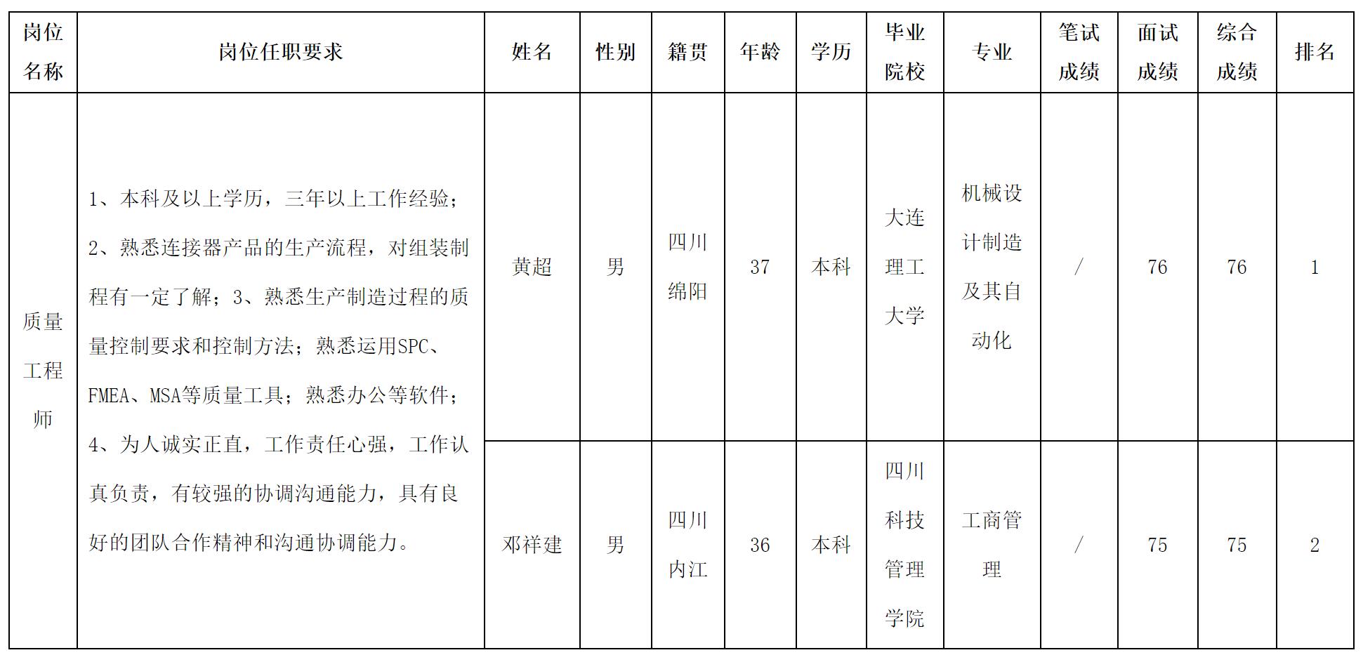 根據(jù)四川華豐科技股份有限公司發(fā)布的招聘公告及招聘相關(guān)規(guī)定,現(xiàn)將測(cè)試成績(jī)予以公示。