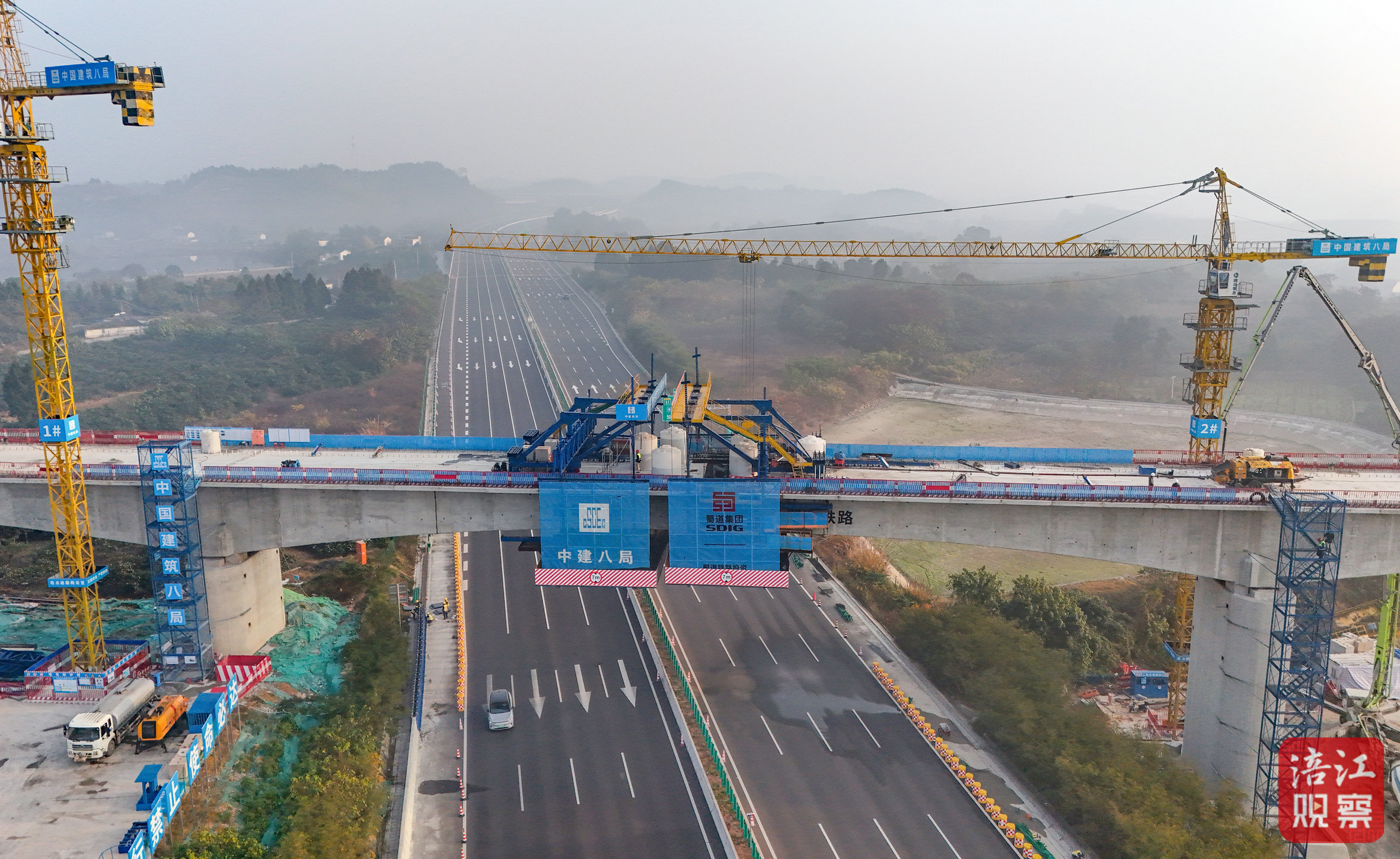 在陽光映照下,這座以75度夾角凌空跨越漢蓉高速公路的“鋼鐵長虹”圓滿接駁,下方高速公路車流如織,施工區(qū)域全封閉的菱形掛籃如一道堅(jiān)固屏障,守護(hù)著“橋上施工、橋下行車”的并行安全。這標(biāo)志著全線首座跨高速公路連續(xù)梁成功貫通,項(xiàng)目建設(shè)取得重大階段性進(jìn)展。
