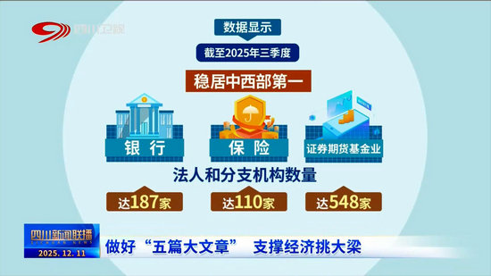 數(shù)據(jù)顯示,截至2025年三季度,全省銀行、保險(xiǎn)、證券期貨基金業(yè)法人和分支機(jī)構(gòu)數(shù)量分別達(dá)187家、110家和548家,穩(wěn)居中西部第一,其中,金融“五篇大文章”貸款余額4.42萬億元,重點(diǎn)領(lǐng)域貸款增速均高于各項(xiàng)貸款增速。