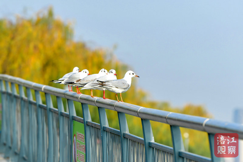 紅嘴鷗棲息在湖岸的欄桿上,悠閑地曬著太陽(yáng),偶爾展開(kāi)潔白的羽翼,輕聲?shū)Q叫,仿佛在享受這難得的溫暖時(shí)光。