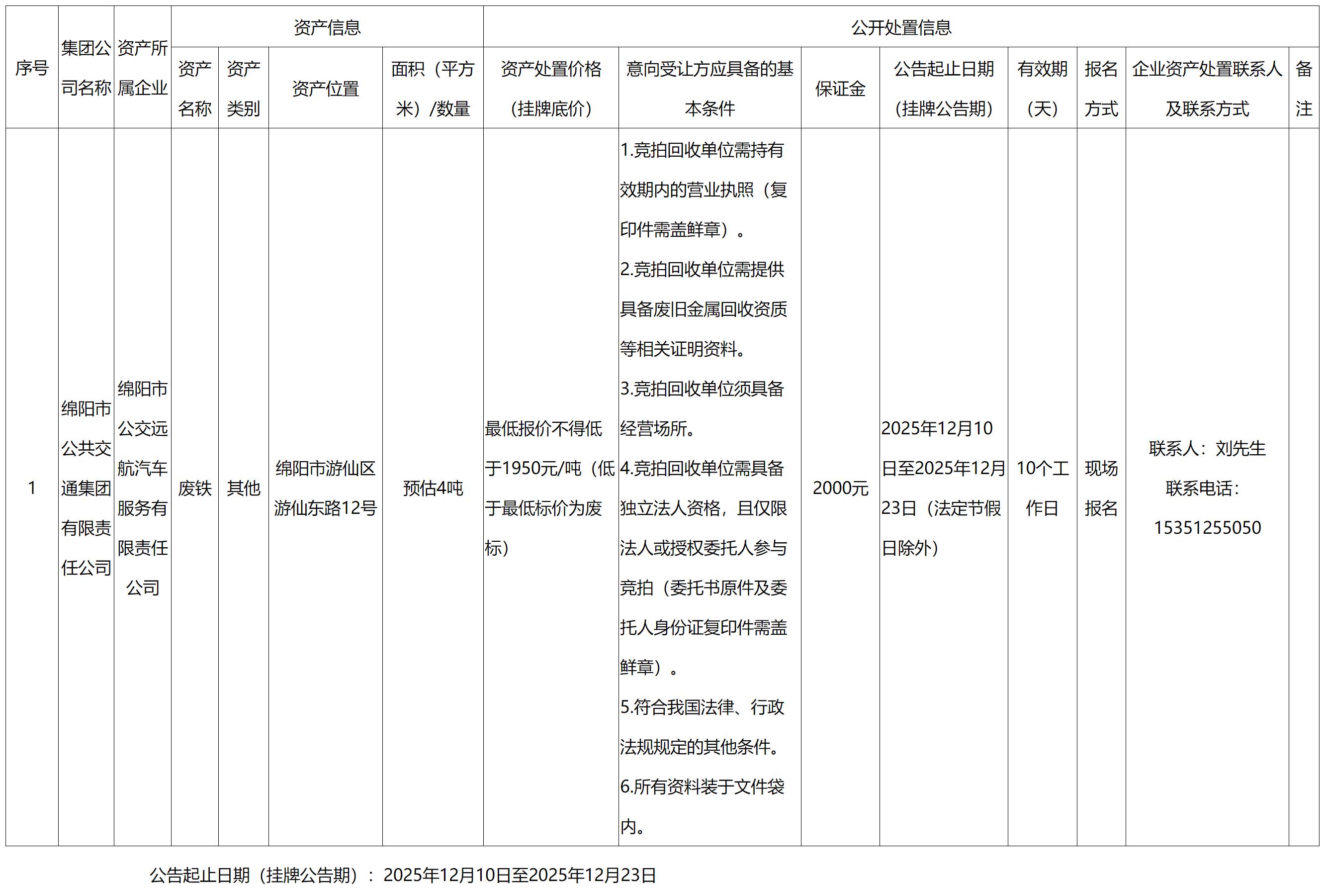 綿陽(yáng)市公共交通集團(tuán)有限公司資產(chǎn)處置公告