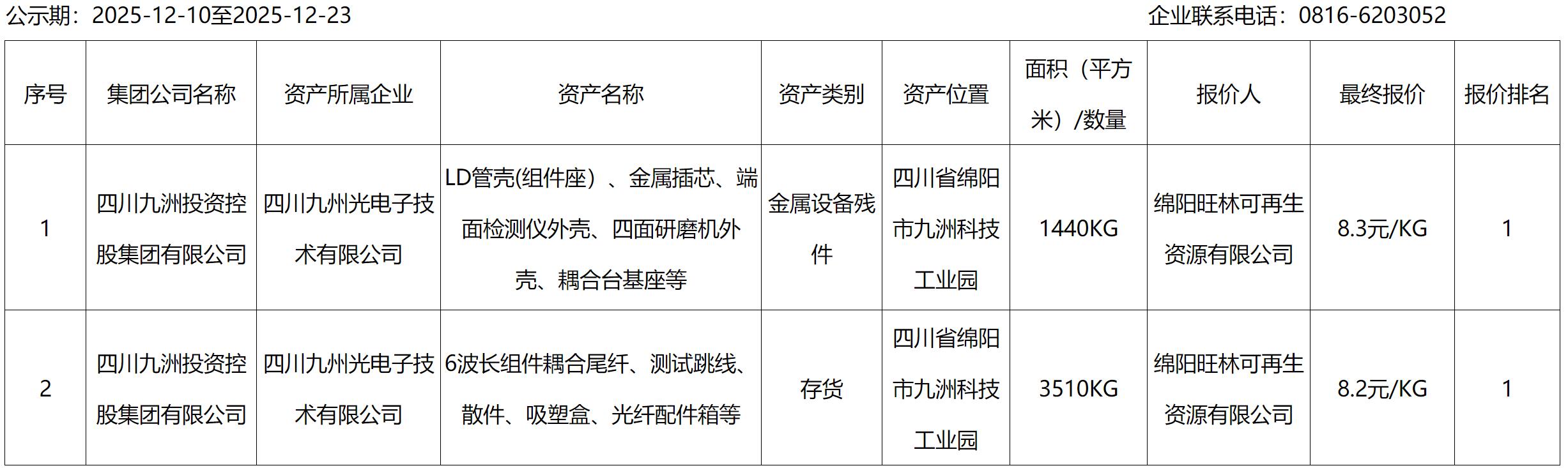 四川九州光電子技術(shù)有限公司積壓物資、報廢設(shè)備資產(chǎn)處置結(jié)果公示