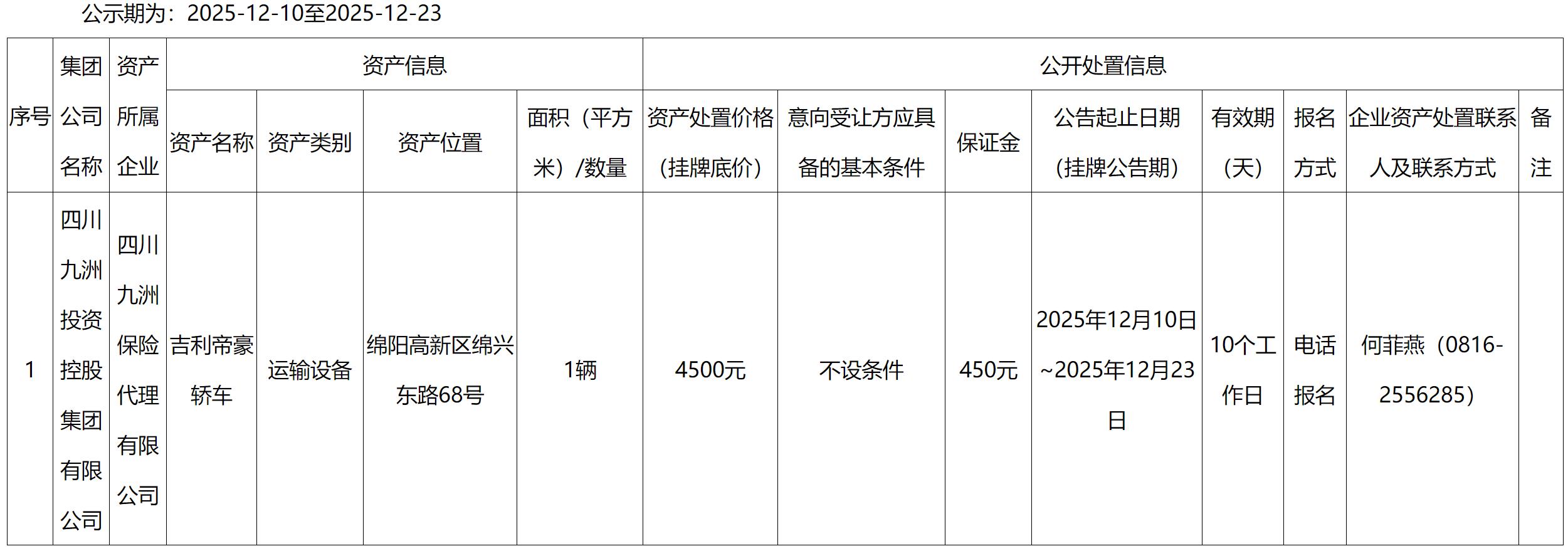 四川九洲保險代理有限公司車輛處置公告