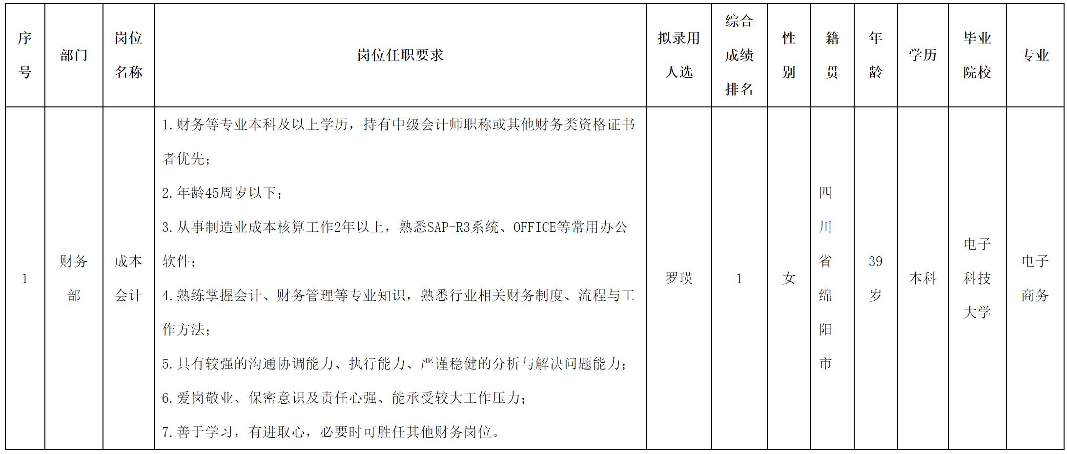 根據(jù)四川愛(ài)聯(lián)科技股份有限公司發(fā)布的招聘公告及招聘相關(guān)規(guī)定,經(jīng)面試、考察、體檢等程序,擬錄用羅瑛同志到財(cái)務(wù)部工作,現(xiàn)予以公示,具體情況如下: