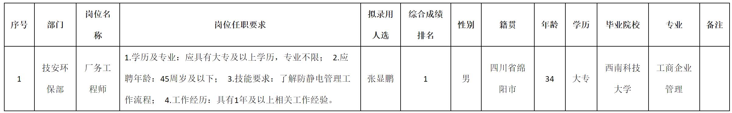 根據(jù)四川九州光電子技術(shù)有限公司發(fā)布的招聘公告及招聘相關(guān)規(guī)定,經(jīng)測試、考察、體檢等程序,擬錄用張顯鵬同志到四川九州光電子技術(shù)有限公司工作,現(xiàn)予以公示,具體情況如下: