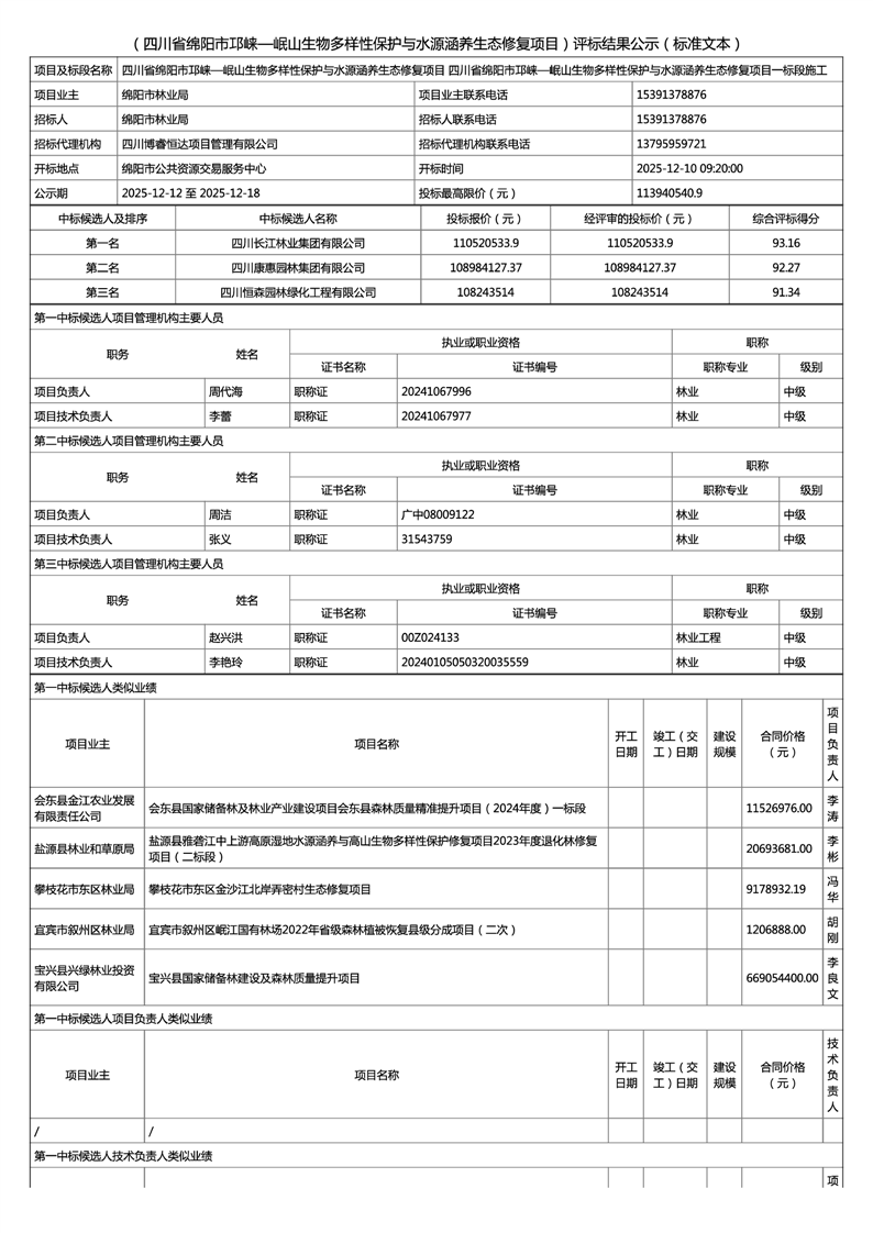 四川省綿陽市邛崍一岷山生物多樣性保護(hù)與水源涵養(yǎng)生態(tài)修復(fù)項(xiàng)目評標(biāo)結(jié)果公示(一標(biāo)段)