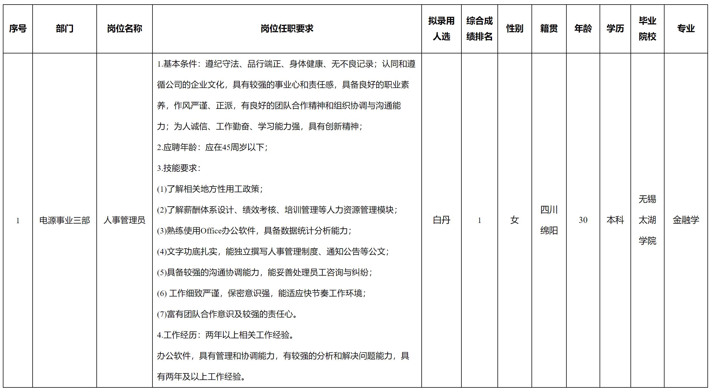 根據(jù)四川長(zhǎng)虹電源股份有限公司發(fā)布的招聘公告及招聘相關(guān)規(guī)定,經(jīng)測(cè)試、考察、體檢等程序,擬錄用吳菊英同志到我司工作,現(xiàn)予以公示,具體情況如下: