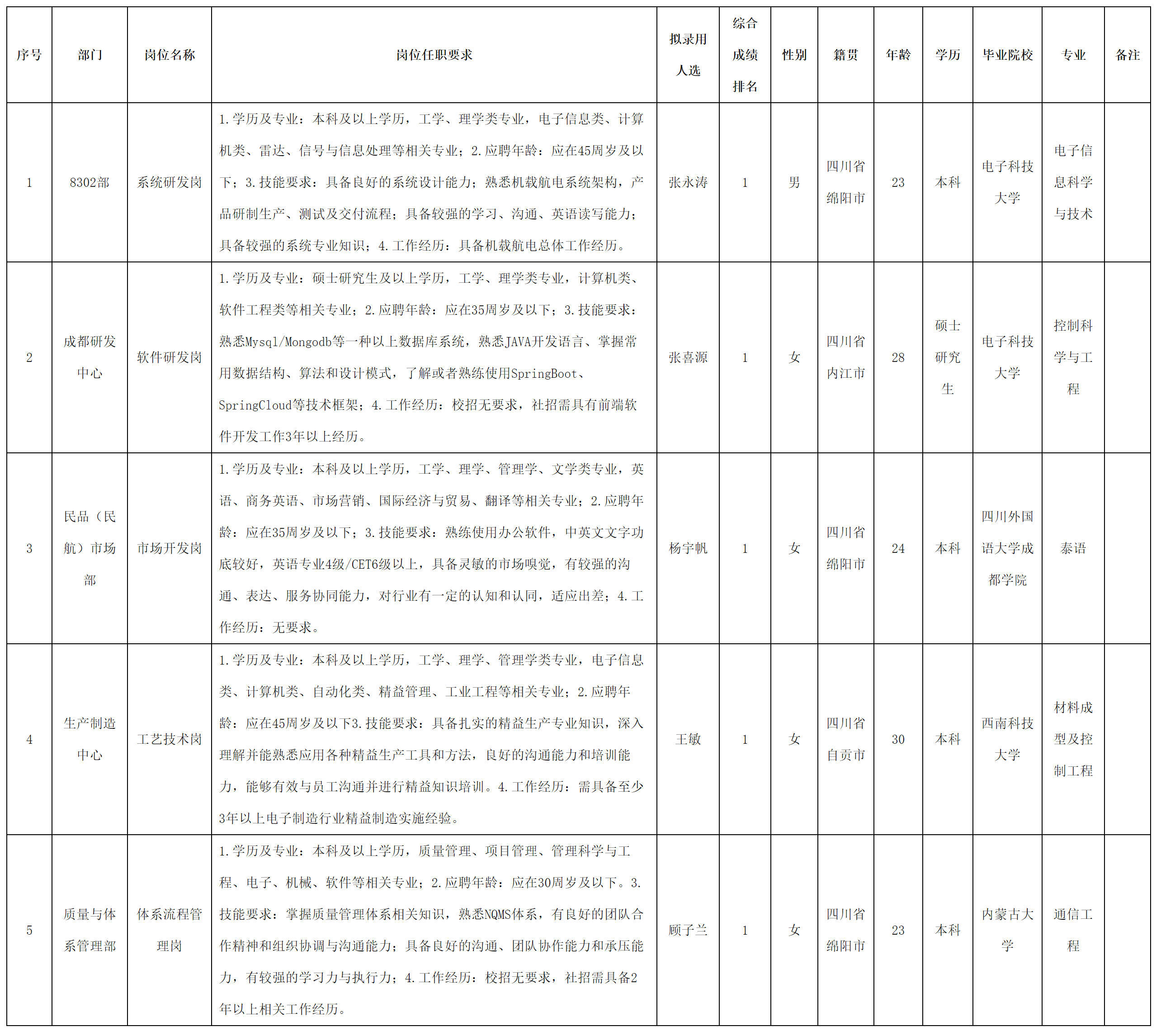 根據四川九洲空管科技有限責任公司發(fā)布的招聘公告及招聘相關規(guī)定,經測試、考察、體檢等程序,擬錄用張永濤等5名同志到四川九洲空管科技有限責任公司工作,現予以公示,具體情況如下: