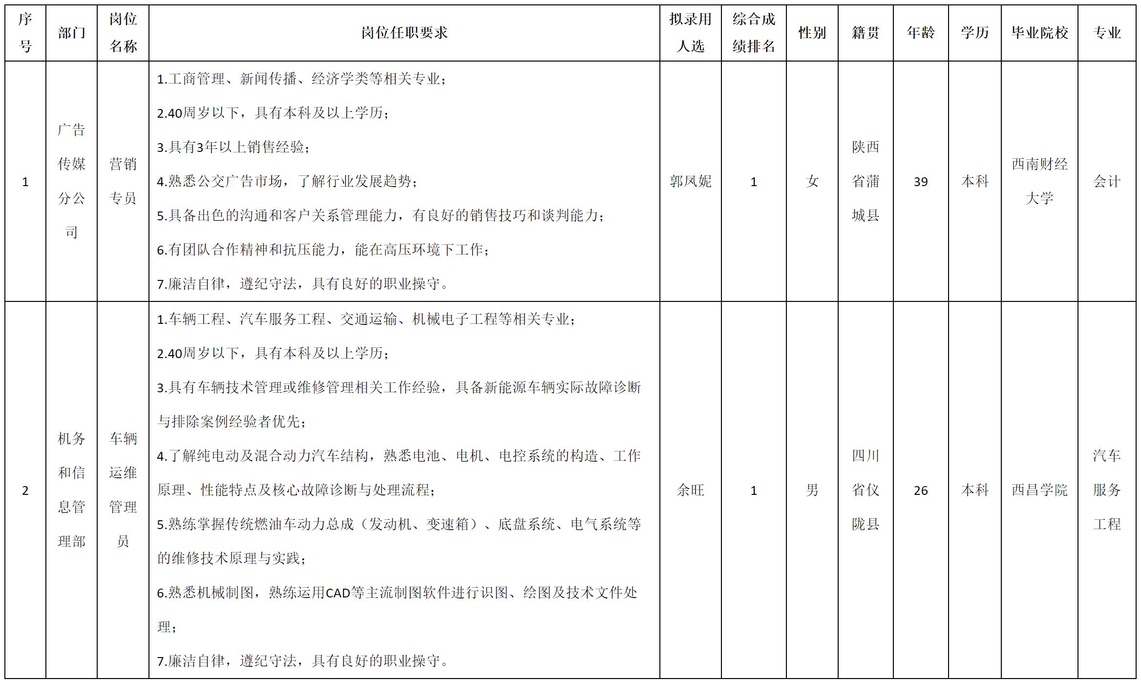 公示期為:2025年12月12日至2025年12月16日。公示期間,如有異議,請以電話、信函等方式向綿陽市公共交通集團有限責任公司黨群人力資源部反映。