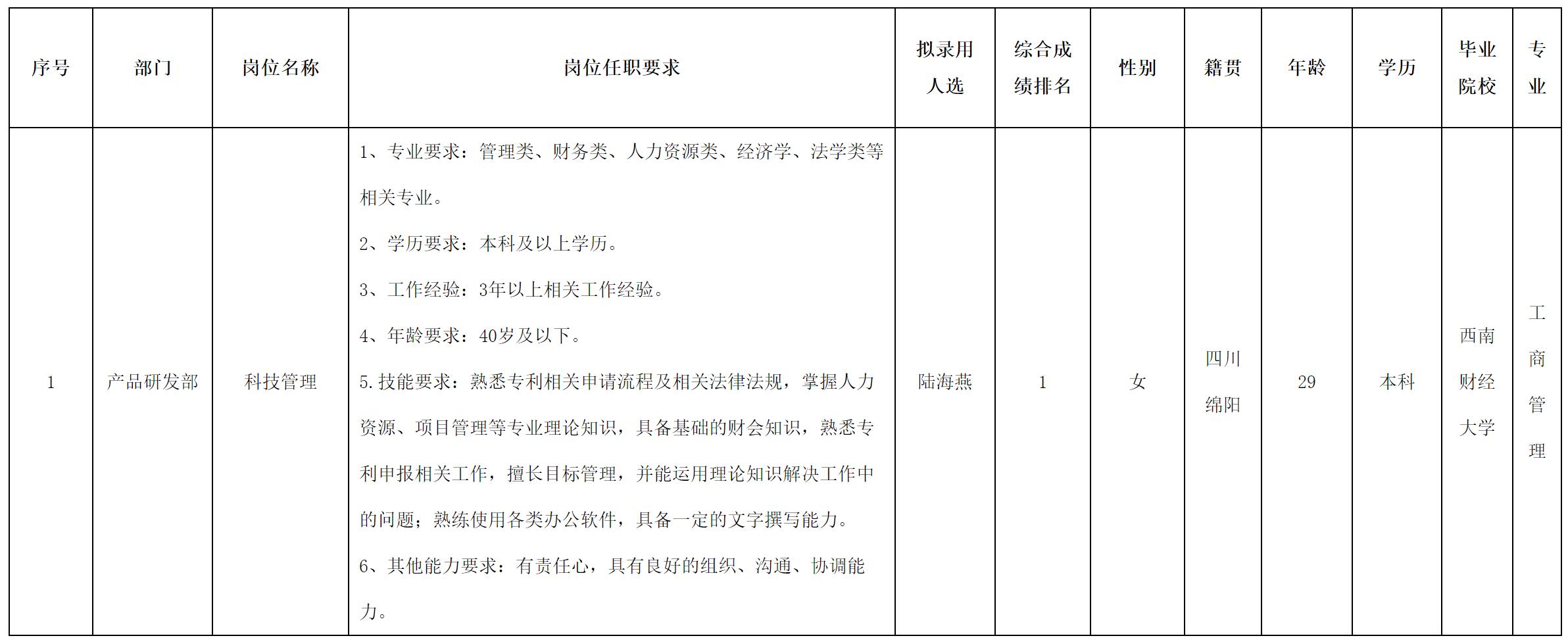 根據(jù)四川愛(ài)創(chuàng)科技有限公司發(fā)布的招聘公告及招聘相關(guān)規(guī)定,經(jīng)面試、考察、體檢等程序,擬錄用陸海燕同志到產(chǎn)品研發(fā)部工作,現(xiàn)予以公示,具體情況如下: