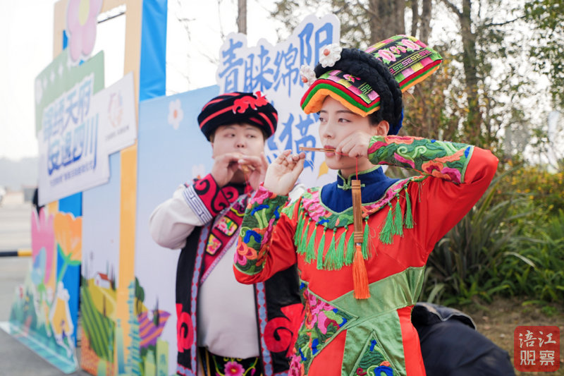 在民族風(fēng)情區(qū),身穿民族服裝的漢子吹羌笛、花帽姑娘轉(zhuǎn)繡球,背景“青睞綿陽 熊貓家園”立牌與服飾相映成趣。“沒想到鄉(xiāng)村不僅有景,還有這么濃的文化味兒!”一位游客邊拍視頻邊感嘆。