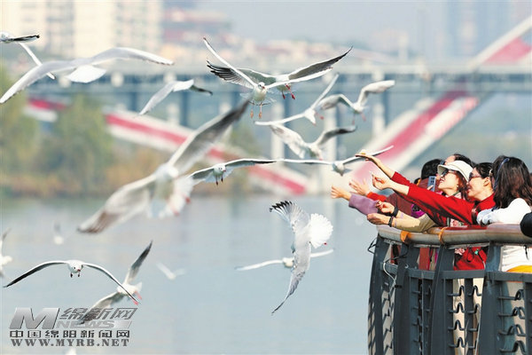 游客打卡三江半島,與紅嘴鷗互動(dòng)嬉戲。