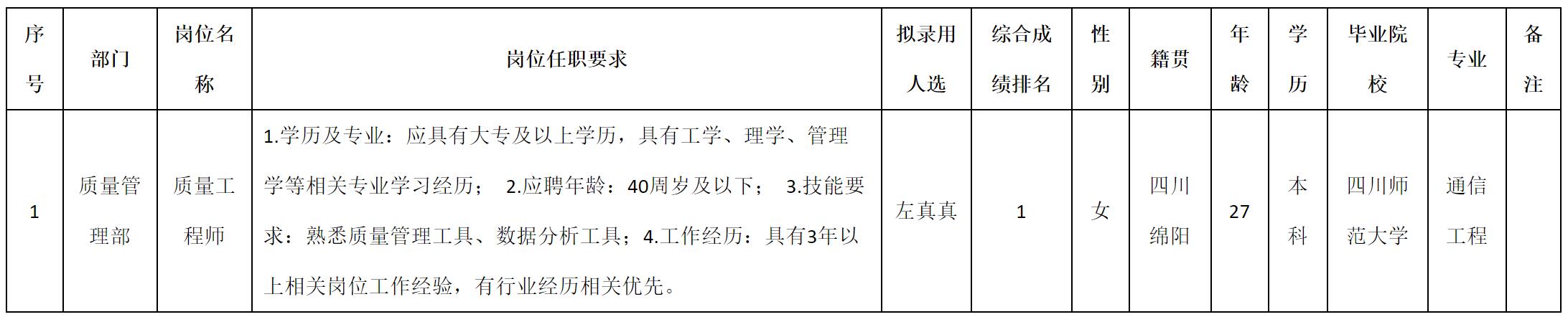 根據(jù)四川九華光子通信技術(shù)有限公司發(fā)布的招聘公告及招聘相關(guān)規(guī)定,經(jīng)測(cè)試、考察、體檢等程序,擬錄用左真真同志到四川九華光子通信技術(shù)有限公司工作,現(xiàn)予以公示,具體情況如下: