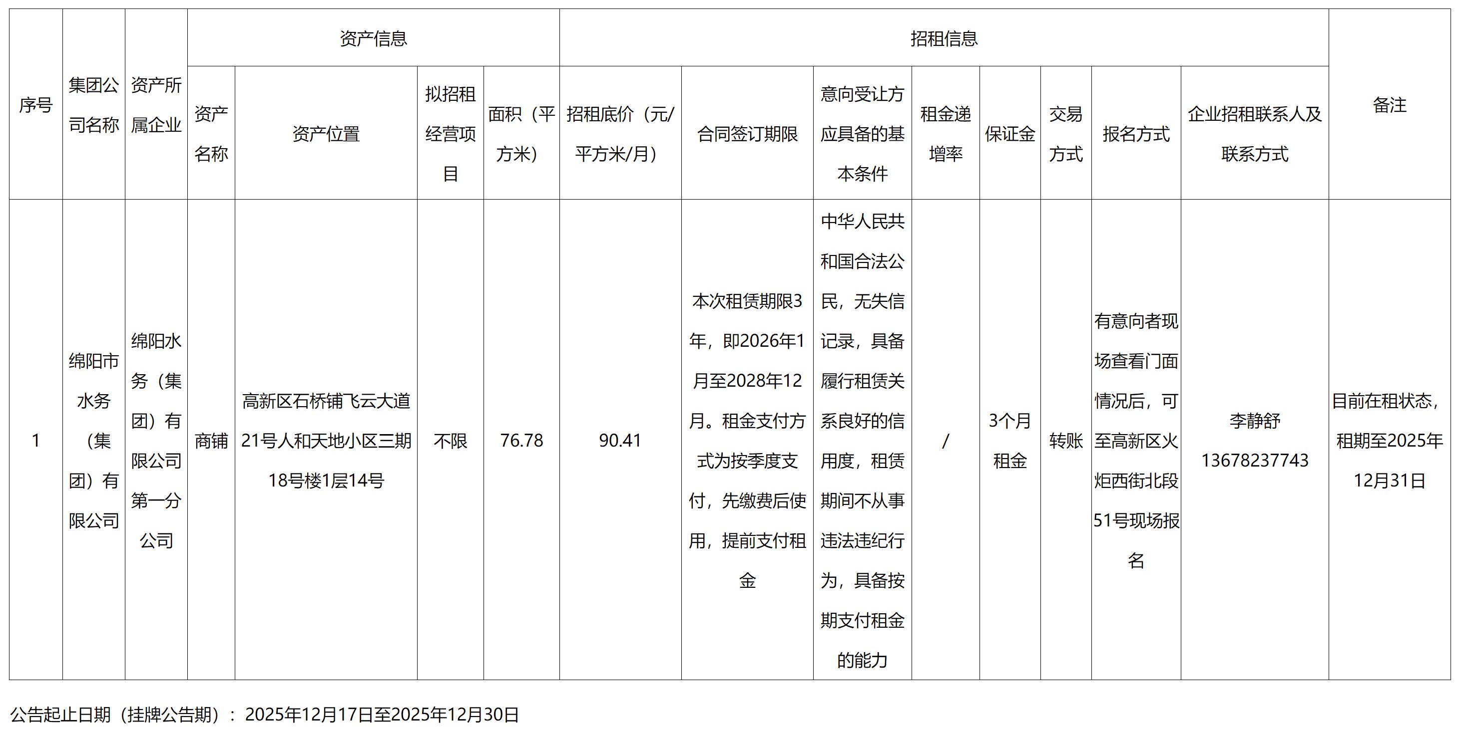 綿陽(yáng)市水務(wù)(集團(tuán))有限公司資產(chǎn)出租公告