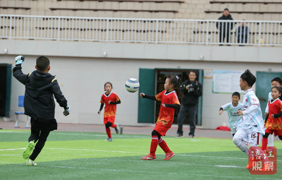 比賽一開(kāi)始,江油女足的小隊(duì)員們便開(kāi)始展現(xiàn)出較為嫻熟的足球技巧,他們?cè)谖迦酥谱闱驁?chǎng)上與同年齡段的男孩們奮力爭(zhēng)搶。別看孩子們小小的個(gè)子,面對(duì)雙語(yǔ)學(xué)校的男隊(duì)員,這些女孩一點(diǎn)也不膽怯,總是想方設(shè)法突破對(duì)方防守。對(duì)方有好幾次射門,大都被江油女足隊(duì)員防守成功,守門員也勇敢地奪下了幾次射門。雙方在球場(chǎng)上你拼我搶,幾乎可以說(shuō)勢(shì)均力敵??偟膩?lái)看,這些小球員們的傳球、停球、射門技巧已經(jīng)有了較好的表現(xiàn)。