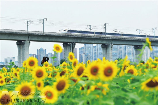 游仙區(qū)石馬鎮(zhèn)紅巖水電站附近,高速動車穿越向日葵花海。 記者 王勇 攝