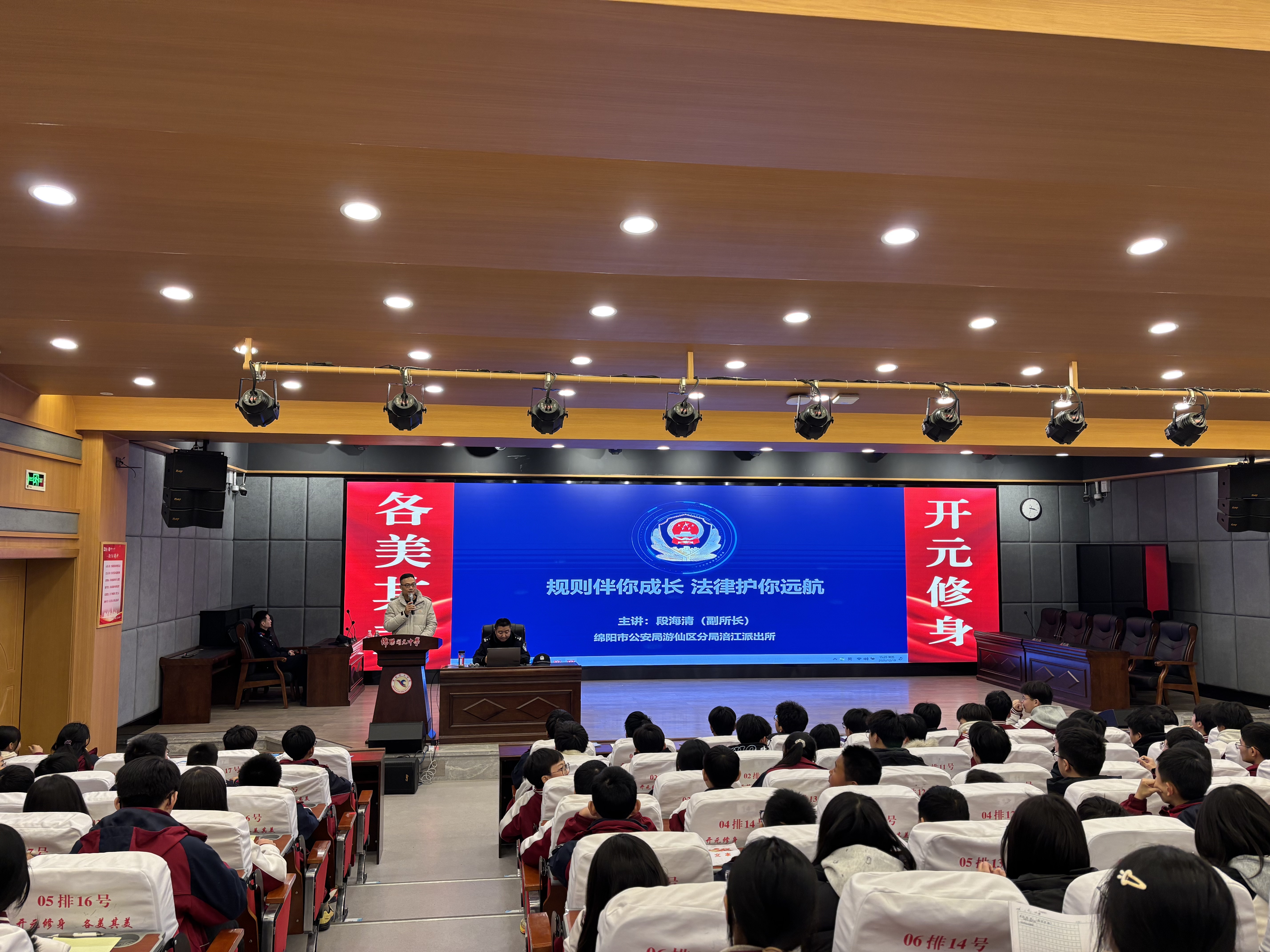 為了進(jìn)一步筑牢師生法治信仰,培育校園法治文化,12月19日下午,綿陽市開元中學(xué)分兩場(chǎng)成功舉辦了以“規(guī)則伴你成長,法律護(hù)你遠(yuǎn)航”為主題的2025年秋遵法守法專題講座活動(dòng),其中一場(chǎng)設(shè)于該校和美樓六樓學(xué)術(shù)廳,另一場(chǎng)設(shè)于和美樓五樓會(huì)議室?;顒?dòng)由該校政教處主任廖建軍主持,特邀綿陽市公安局游仙區(qū)分局涪江派出所副所長段海清擔(dān)任主講,為全體師生帶來兩堂深刻而生動(dòng)的法治教育課。