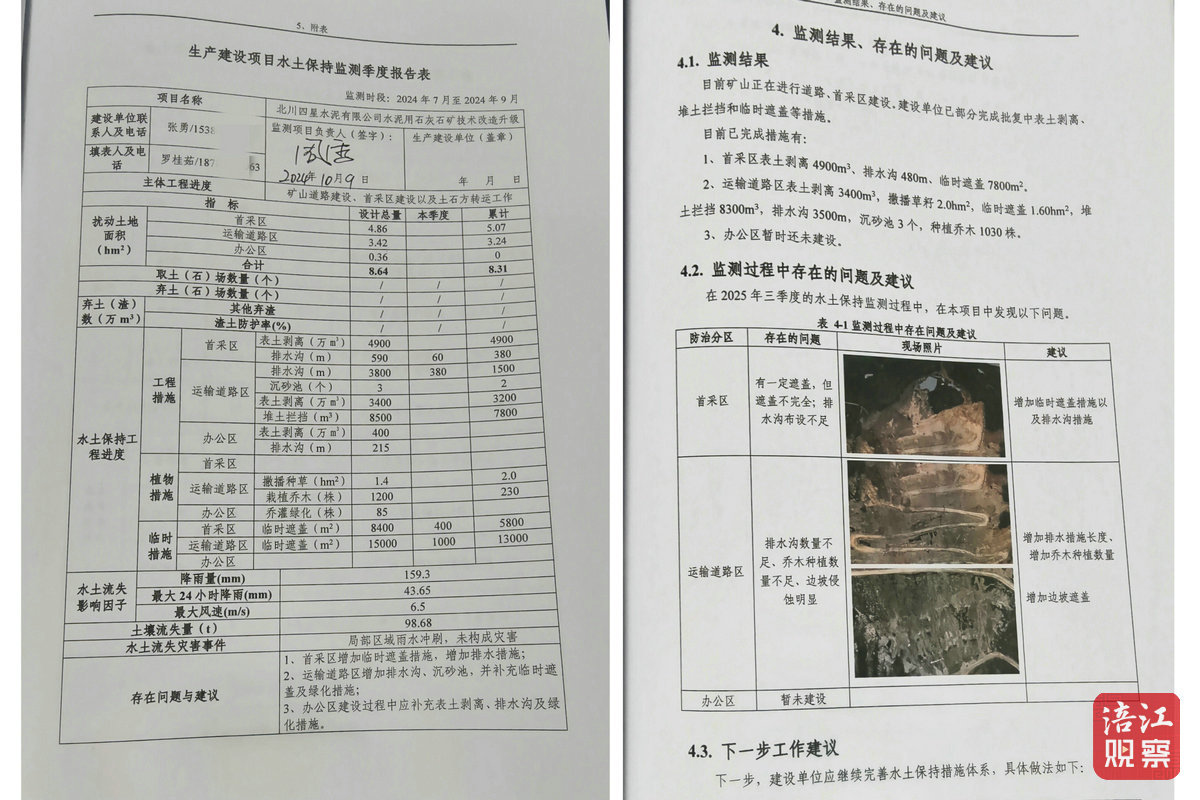 然而,記者查閱該礦山水土保持監(jiān)測季度報(bào)告發(fā)現(xiàn),從2024年第三季度開始,連續(xù)多期報(bào)告均指出“排水溝淤堵”“沉砂池淤積”“裸露邊坡未覆蓋”等問題,并附有現(xiàn)場照片。報(bào)告多次建議整改,但相同問題在后續(xù)報(bào)告中仍反復(fù)出現(xiàn)。