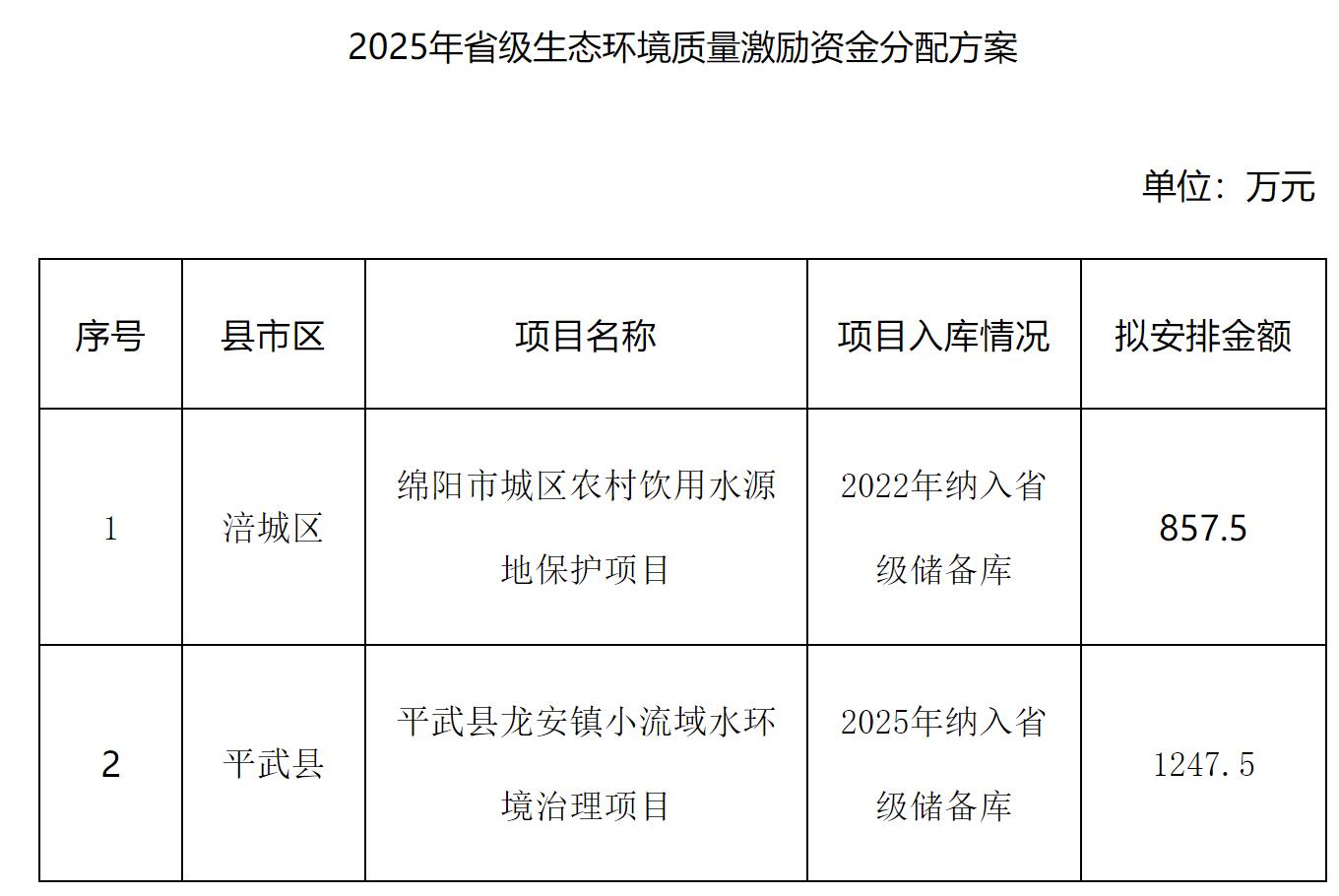 四川省財政廳、四川省生態(tài)環(huán)境廳以川財資環(huán)〔2025〕65號號下達(dá)我市2025年省級生態(tài)環(huán)境質(zhì)量激勵資金2105萬元。根據(jù)“資金跟著項目走”的要求,我局選取央省儲備庫符合資金分配條件的項目,會同綿陽市財政局?jǐn)M定了資金分配方案,現(xiàn)予以公示。