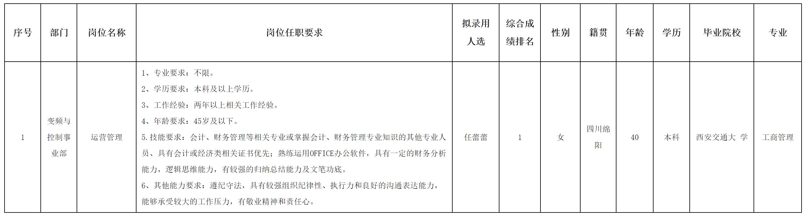 根據(jù)四川愛創(chuàng)科技有限公司發(fā)布的招聘公告及招聘相關規(guī)定,經面試、考察、體檢等程序,擬錄用任蕾蕾同志到變頻與控制事業(yè)部工作,現(xiàn)予以公示,具體情況如下: