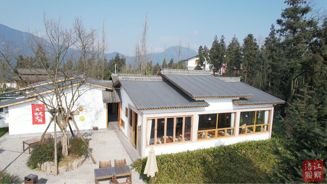 青瓦白墻的中式院落掩映于蒼翠林木之間,光影流轉(zhuǎn)間盡顯通透與溫暖。屋前碎石小徑旁,雕花木桌、木椅與門窗上張貼的紅色剪紙透著濃濃的年節(jié)喜氣;遠(yuǎn)處的群峰連綿,湛藍(lán)天空映襯著光禿的枝丫,清冽的空氣里彌漫著閑適與詩意。