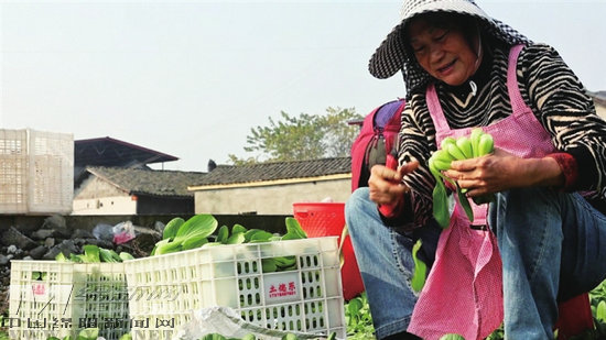 村民忙著上海青采收、裝筐。 記者 安崢 攝