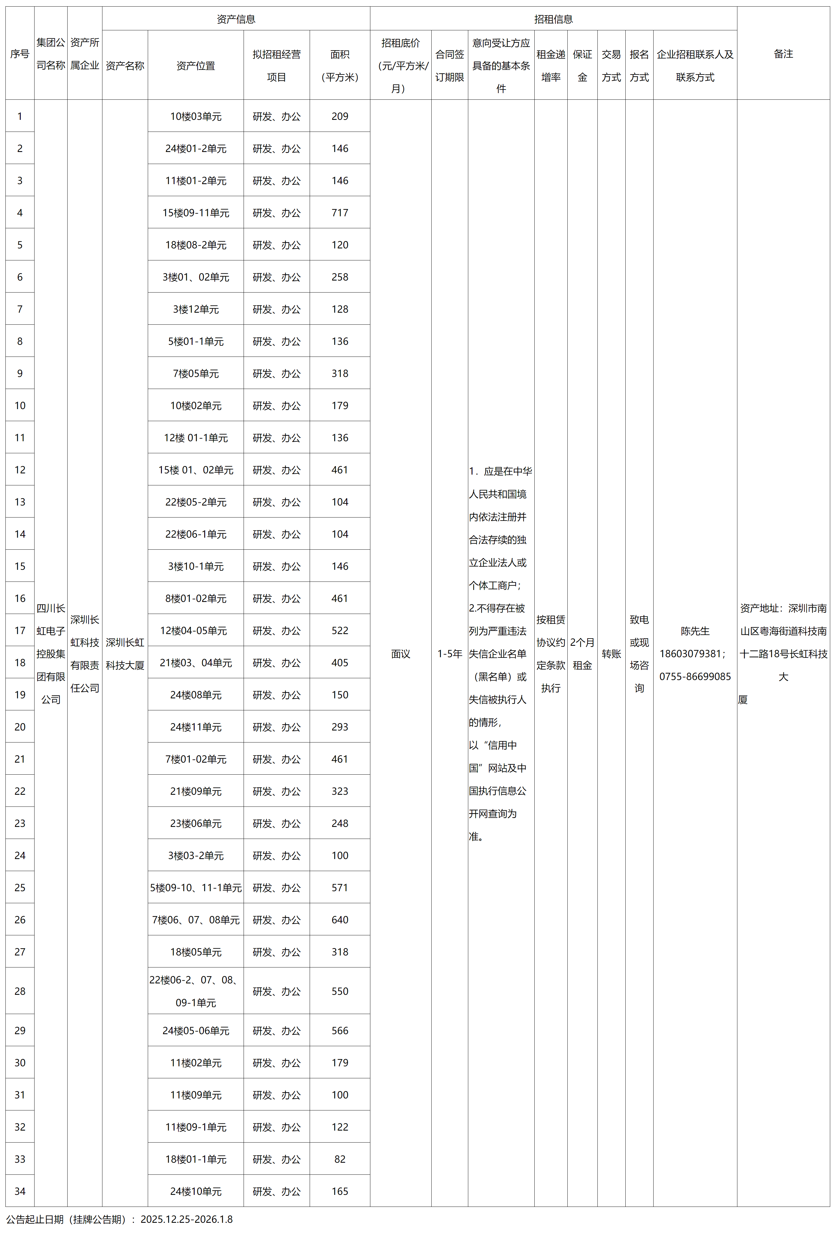 深圳長虹科技有限責(zé)任公司資產(chǎn)出租公告