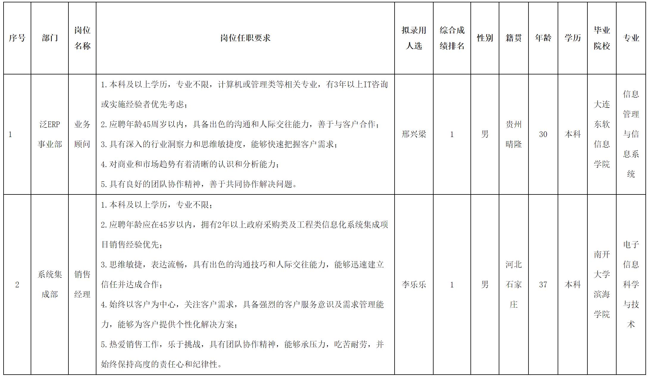 根據(jù)四川虹信軟件股份有限公司發(fā)布的招聘公告及招聘相關規(guī)定,經(jīng)測試、考察、體檢等程序,擬錄用邢興梁、李樂樂同志到四川虹信軟件股份有限公司工作,現(xiàn)予以公示,具體情況如下: