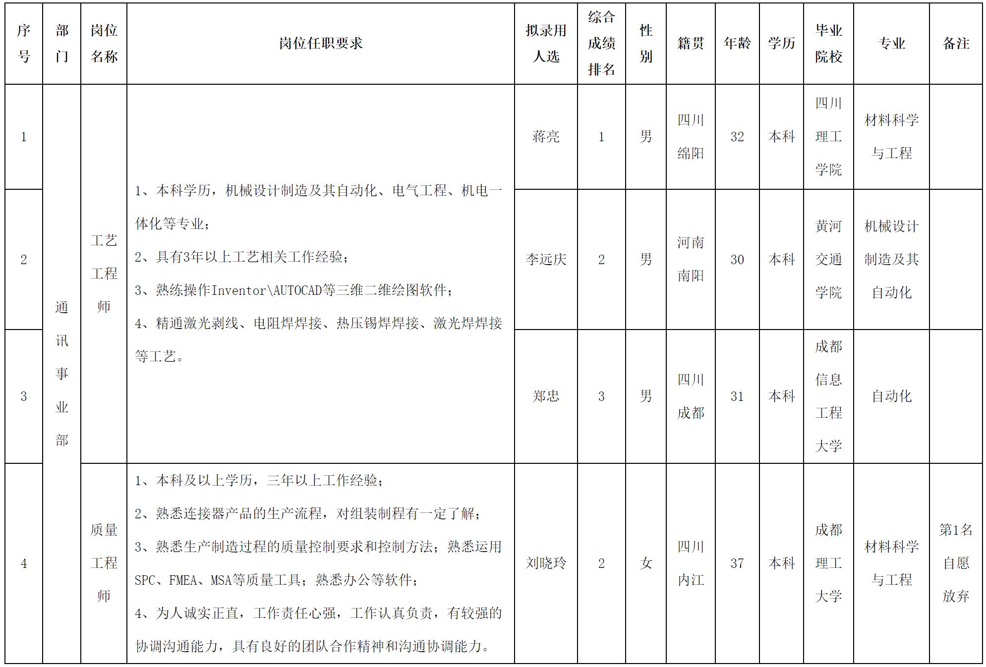 根據(jù)四川華豐科技股份有限公司發(fā)布的招聘公告及招聘相關(guān)規(guī)定,經(jīng)測(cè)試等程序,擬錄用蔣亮等同志到四川華豐科技股份有限公司工作,現(xiàn)予以公示,具體情況如下: