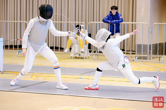 開幕式結(jié)束后,迎來了本次總決賽的第一場對決——個人賽。劍道旁,兩位率先出戰(zhàn)的“小劍客”正在進(jìn)行最后準(zhǔn)備。他們身穿潔白的金屬衣防護(hù)服,反復(fù)檢查著手中的劍尖與手線。