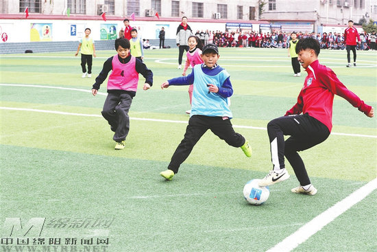 九洲長虹隊與小學(xué)生舉行足球友誼賽。