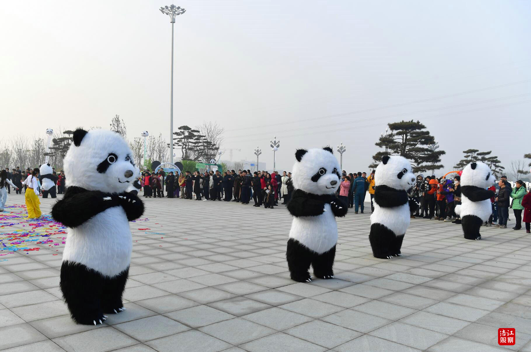 “奇妙巡游”中,可愛的充氣熊貓人偶與游客親切互動,合影留念;