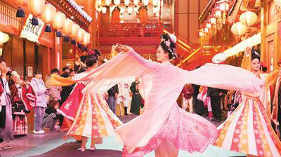 演員在陜西西安的長(zhǎng)安十二時(shí)辰主題街區(qū)進(jìn)行沉浸式表演。