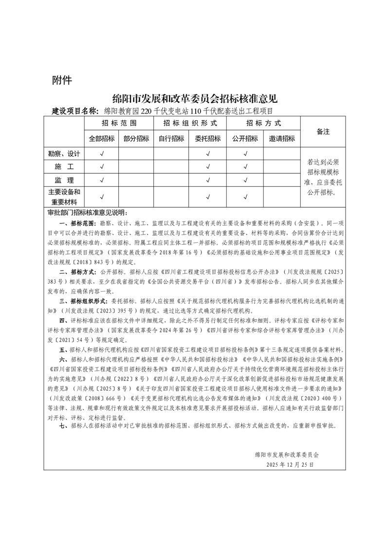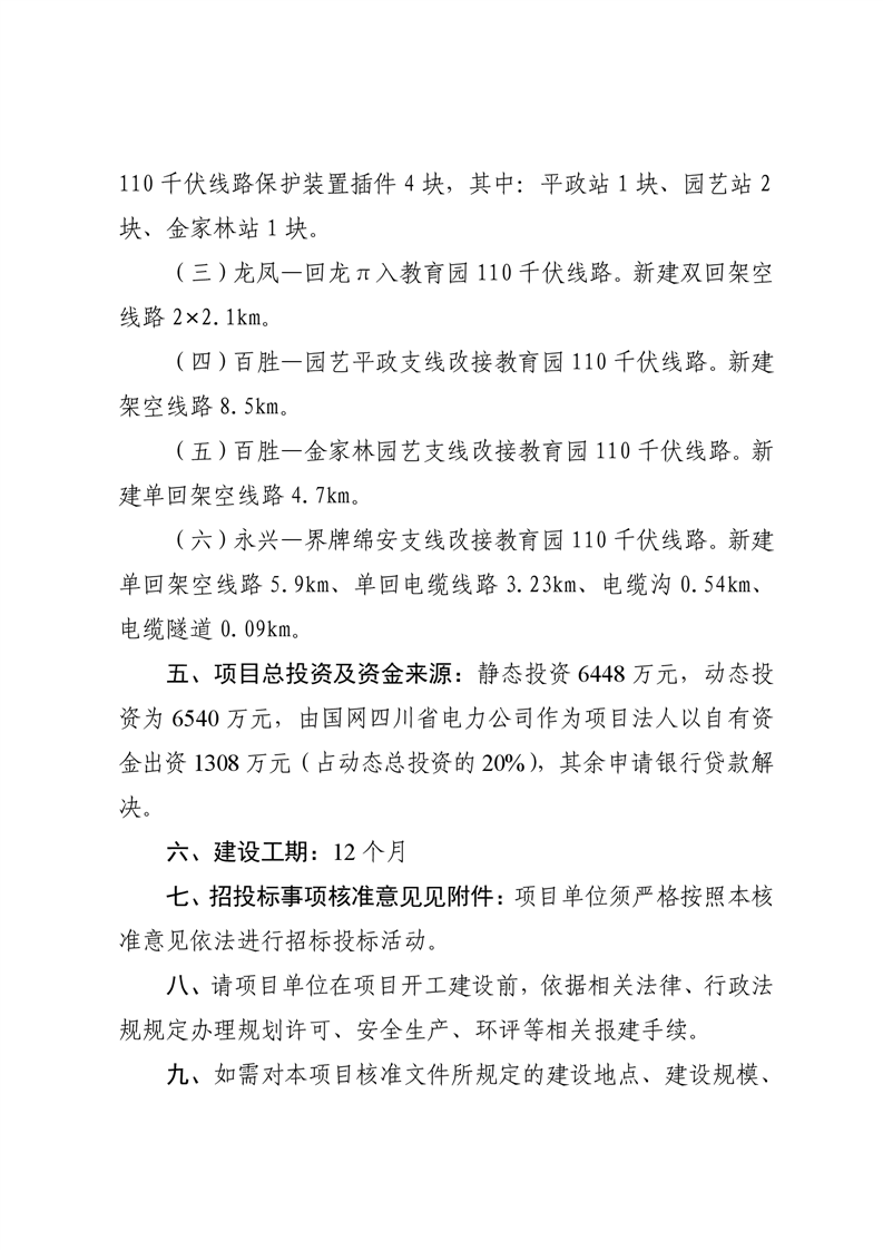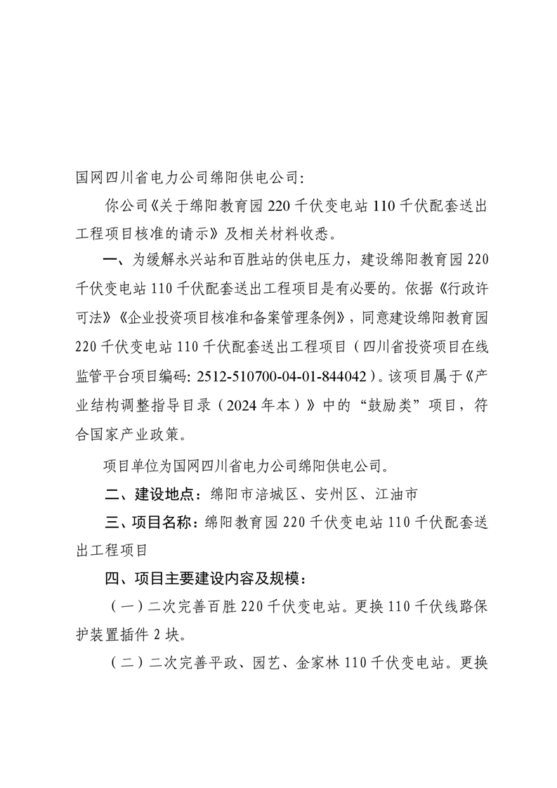 綿陽市發(fā)展和改革委員會關(guān)于綿陽教育園220千伏變電站110千伏配套送出工程項目核準(zhǔn)的批復(fù)