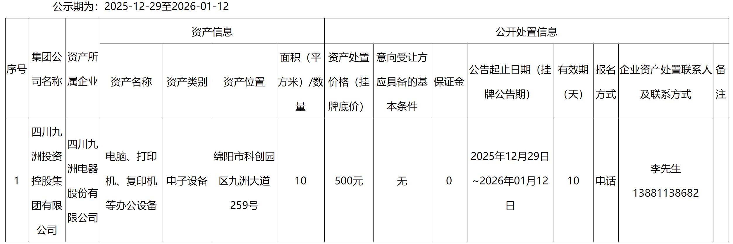 四川九洲電器股份有限公司資產(chǎn)處置公告