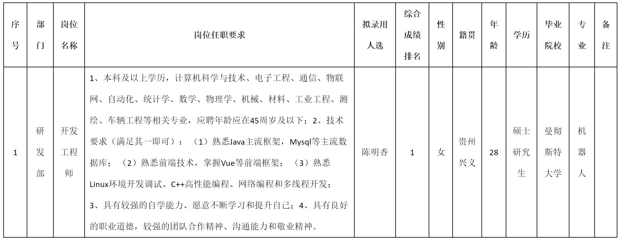 根據(jù)四川九洲投資控股集團有限公司軟件與數(shù)據(jù)智能軍團發(fā)布的招聘公告及招聘相關(guān)規(guī)定,經(jīng)測試、考察、體檢等程序,擬錄用陳明香同志到四川九洲投資控股集團有限公司軟件與數(shù)據(jù)智能軍團工作,現(xiàn)予以公示,具體情況如下: