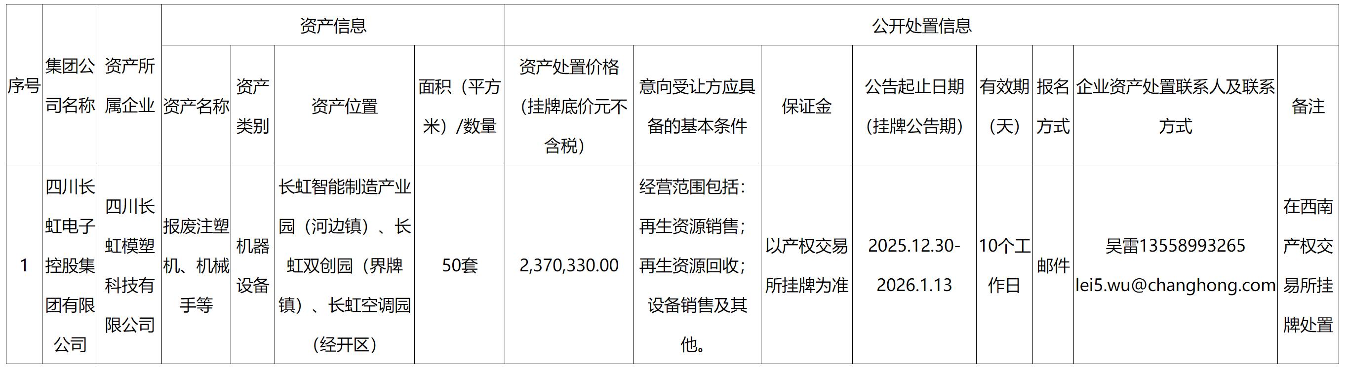 四川長(zhǎng)虹模塑科技有限公司機(jī)器設(shè)備處置公告