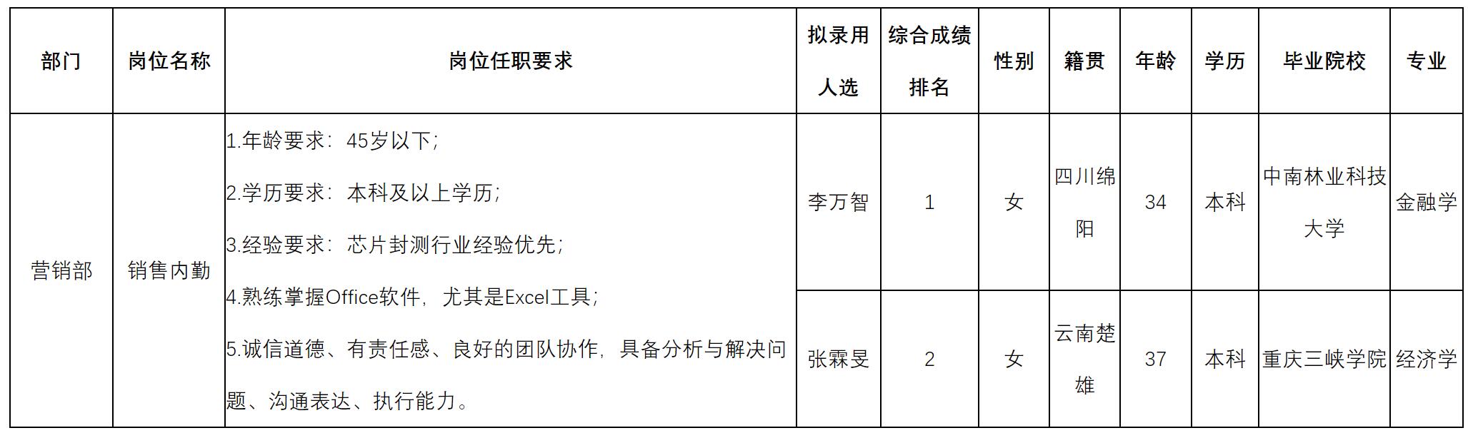根據(jù)四川啟賽微電子有限公司發(fā)布的招聘公告及招聘相關(guān)規(guī)定,經(jīng)用人單位面試程序,擬錄用李萬智、張霖旻同志到四川啟賽微電子有限公司工作,現(xiàn)予以公示,具體情況如下: