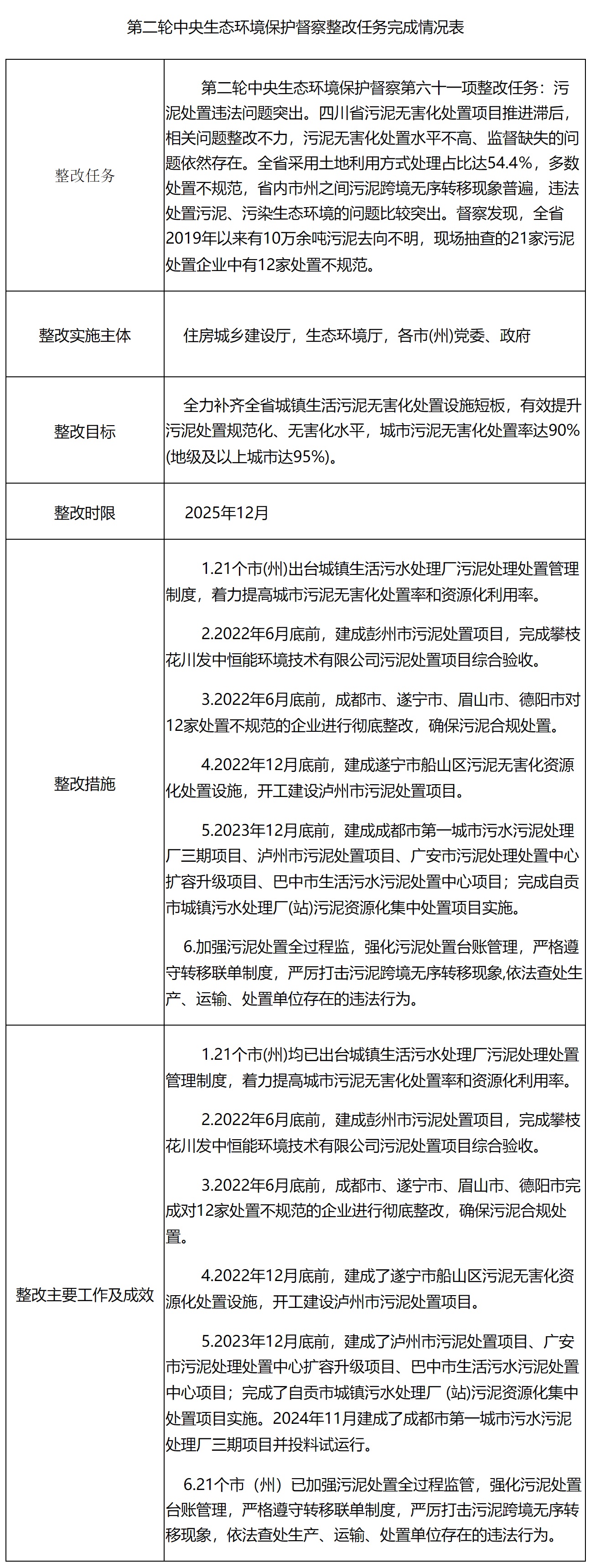 第二輪中央生態(tài)環(huán)境保護(hù)督察第六十一項整改任務(wù)已完成,并通過驗收,擬按程序?qū)嵤╀N號。根據(jù)《四川省生態(tài)環(huán)境保護(hù)督察問題整改銷號辦法(2023年修訂)》有關(guān)要求,現(xiàn)將該項任務(wù)整改完成情況予以公示,公示期為2025年12月31日至2026年1月14日。