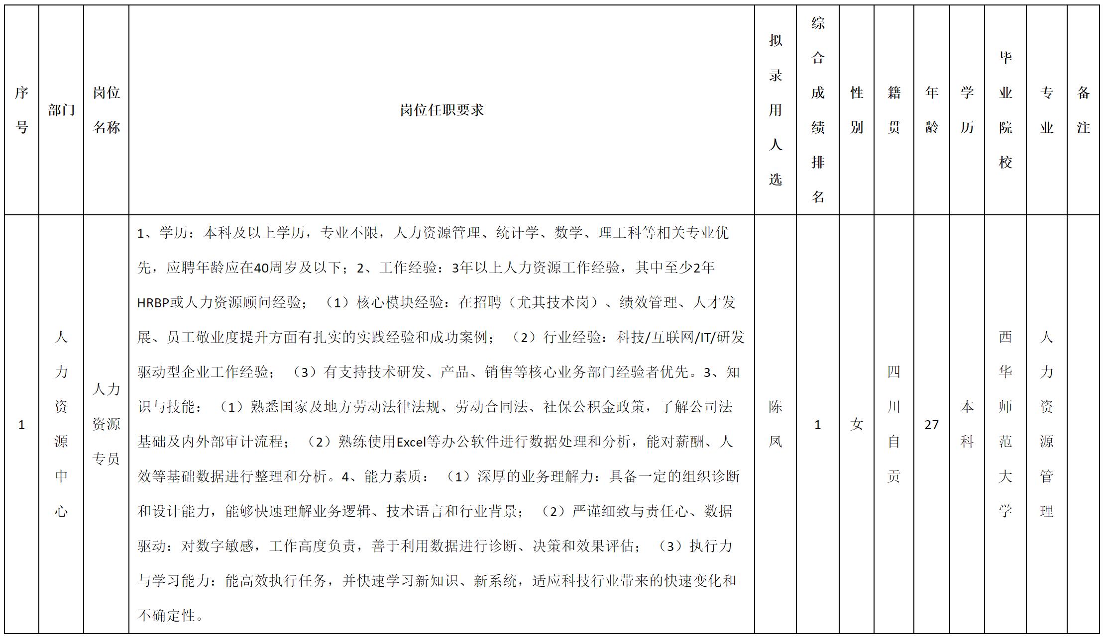 根據(jù)四川九洲投資控股集團(tuán)有限公司軟件與數(shù)據(jù)智能軍團(tuán)發(fā)布的招聘公告及招聘相關(guān)規(guī)定,經(jīng)測試、考察、體檢等程序,擬錄用陳鳳同志到四川九洲投資控股集團(tuán)有限公司軟件與數(shù)據(jù)智能軍團(tuán)工作,現(xiàn)予以公示,具體情況如下: