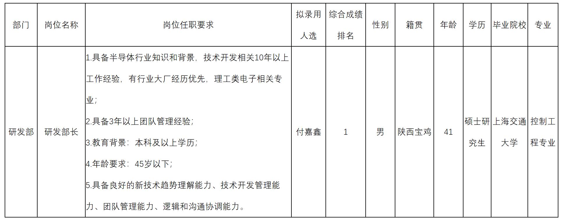 根據(jù)四川啟賽微電子有限公司發(fā)布的招聘公告及招聘相關(guān)規(guī)定,經(jīng)用人單位面試程序,擬錄用付嘉鑫同志到四川啟賽微電子有限公司工作,現(xiàn)予以公示,具體情況如下: