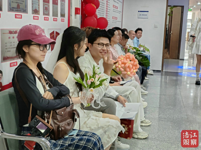 在江油市民政局婚姻登記處,眾多新人手捧鮮花,歡喜地從辦證窗口工作人員手里接過結(jié)婚證書。天氣炎熱,排隊登記的新人較多,頒證廳空調(diào)全開,工作人員除了熱情服務(wù),還準(zhǔn)備了免費的茶水糕點。