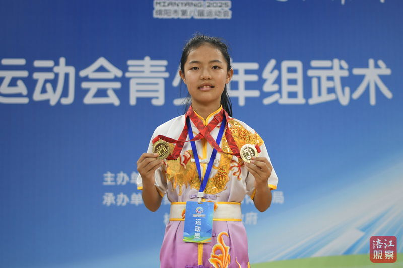 來自綿陽中學英才學校的小選手陶悅?cè)鸾衲?2歲,此次比賽獲得直屬學校小學女子甲組傳統(tǒng)拳、傳統(tǒng)器械2枚金牌。