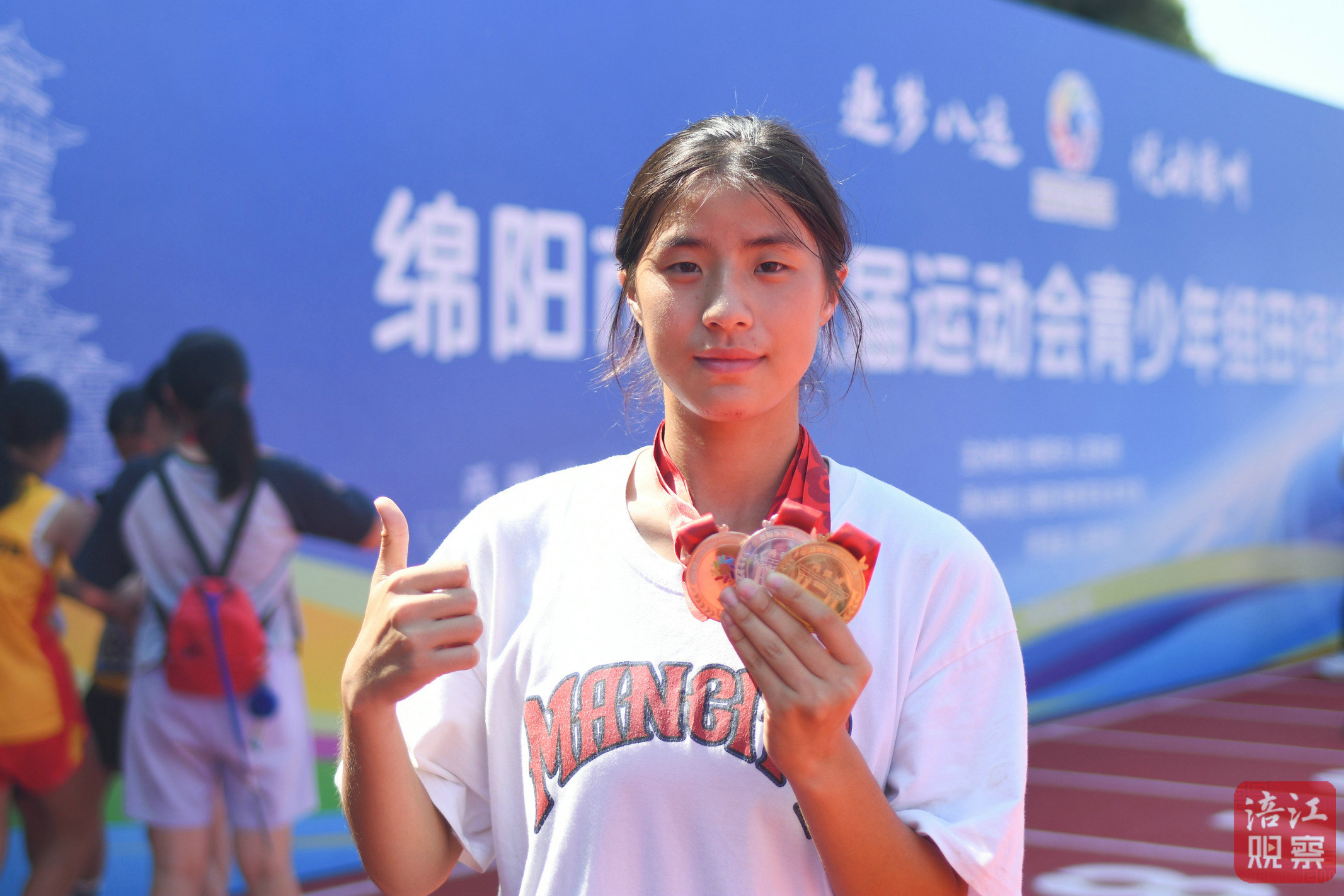 涪城區(qū)代表隊17歲選手胡邵桐在此次比賽中收獲滿滿,不僅獲得高中甲組女子五項全能(100米欄、800米、跳高、跳遠、鉛球)金牌,還獲得4X100米銀牌,4x400米銅牌。