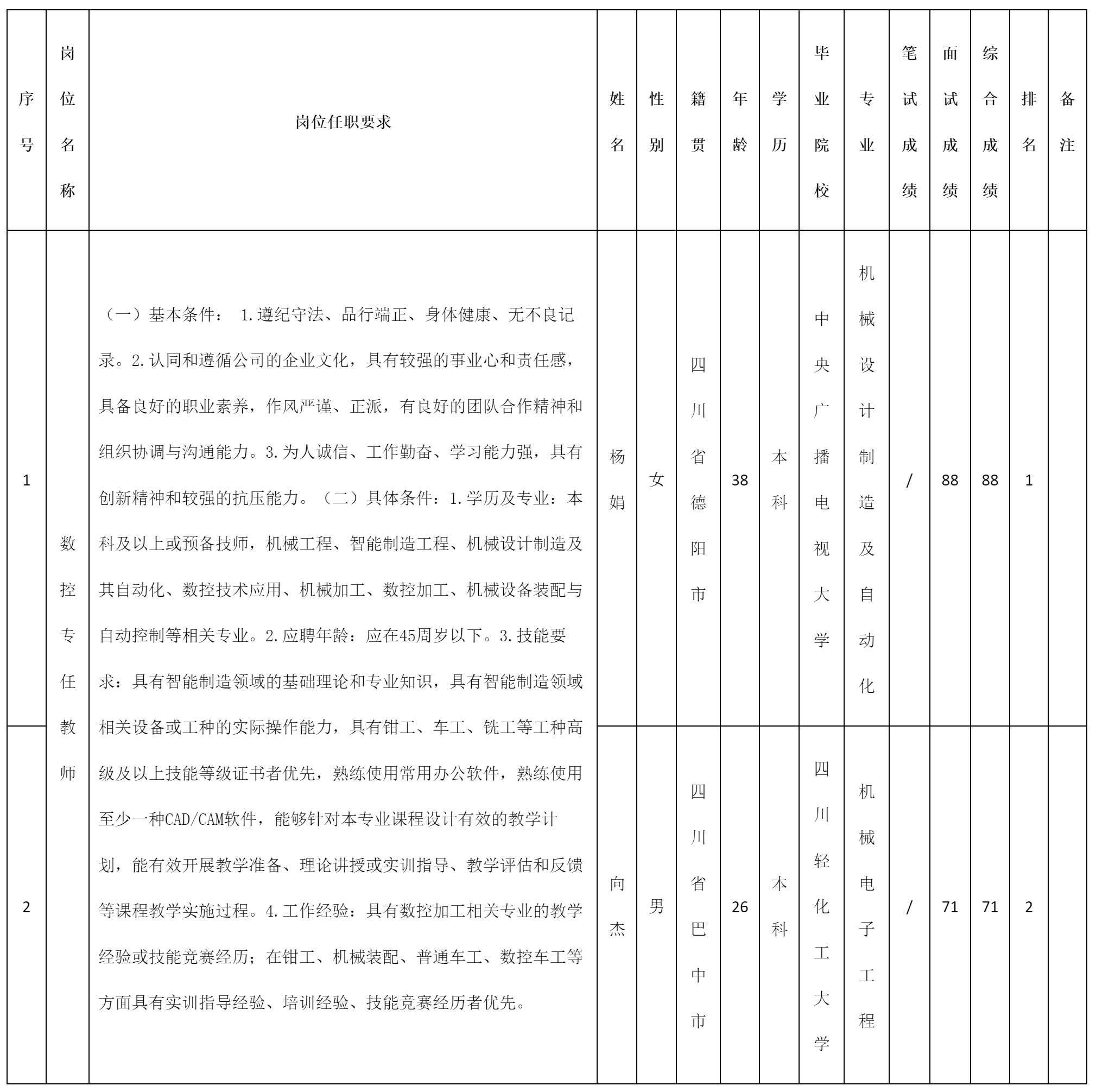 根據(jù)四川九洲教育投資管理有限公司發(fā)布的招聘公告及招聘相關(guān)規(guī)定,經(jīng)筆試、面試等程序,現(xiàn)將筆試(面試)成績予以公示。